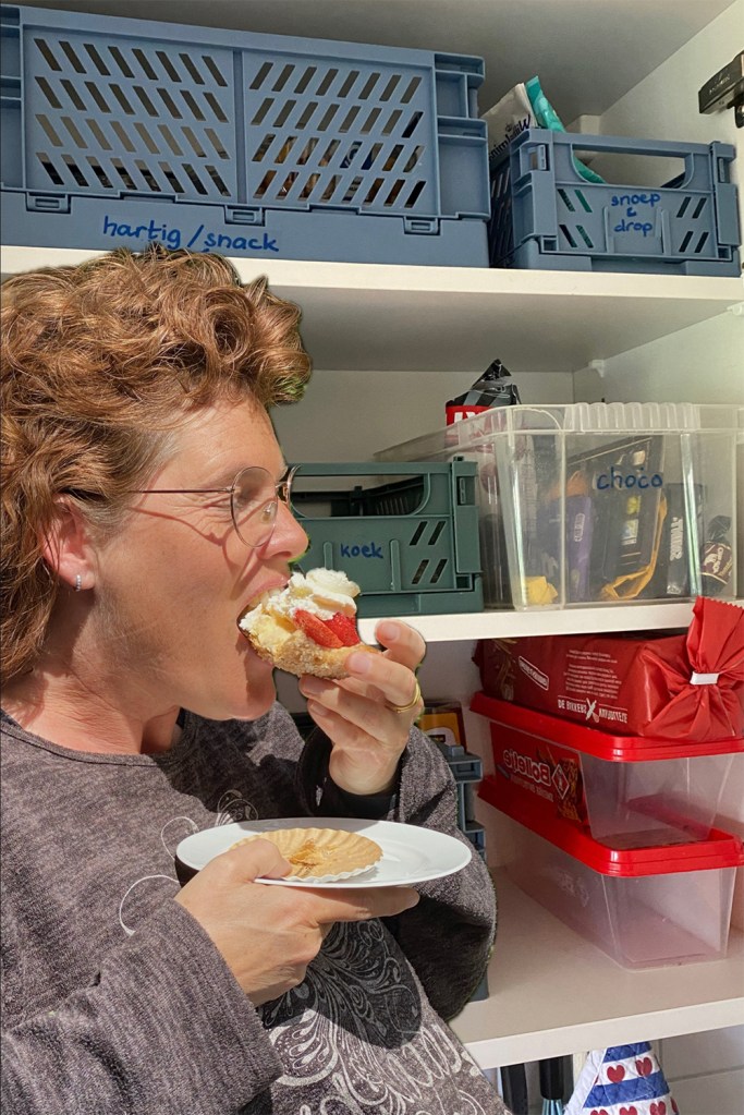 Maar voor nu, kan ik me nog niet eens aankleden! Ik weet dat afleiding kan helpen om met de pijn om te gaan en dan ik trek de koelkast open op zoek naar comfort food. En mijn kastjes met mandjes en bakjes, waar respectievelijk: ‘koek’, ‘chocolade’, ‘drop & snoep’, ‘hartig’ in de vorm van chips en nootjes en ‘overig’, waar crackers & ontbijtkoek in zitten. Dezelfde vriendin van de scooter plaagt mij daar mateloos mee. ‘Willeke en bakjes!’ Oké, ik geef toe: ik hou van opruimen en organiseren. Alles lekker praktisch! Zo gemakkelijk mogelijk. Niet hoeven zoeken naar dingen of voor de zoveelste keer het wiel uitvinden. Ik bedenk een systeem en ga zorgen dat het werkt. Net zoals ik in mijn werkende tijd dol was op draaiboeken maken. Lekker overzichtelijk én handig voor een volgende keer!