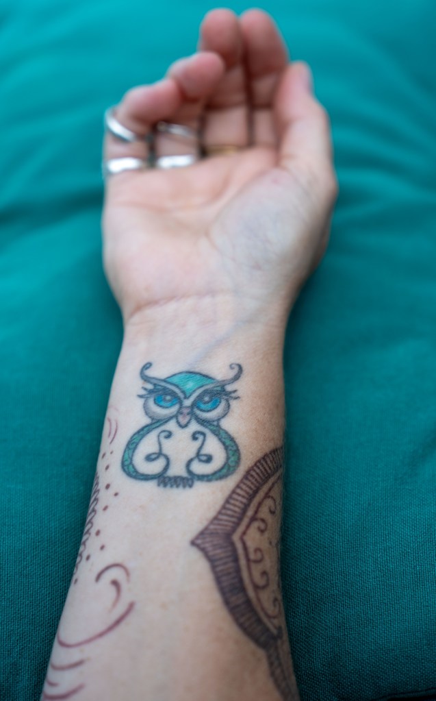 Op een nacht kreeg ik een droom. Een enorme Oehoe (uil) kwam naar me toe en sloeg haar mega grote vleugels om me heen. Ik voelde me zo geborgen! Zo veilig! Het gevoel: je bent nooit meer alleen! Later heb ik op de binnenkant van mijn pols een tattoo van een uil laten zetten, die mijn dochter en ik samen ontworpen hebben. Een teken van vertrouwen, ik ben niet alleen, het komt altijd weer goed!