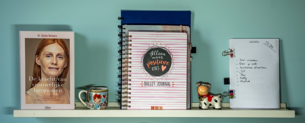Op de foto zie je ook het boek van ‘De kracht van vrouwelijke hormonen’, van Dr. Sylvie Demers. Ik ben nu negen maanden bezig met bio-identieke hormonen (oestrogenen en progesteron) aanvullen via gel en een capsule. Door de (peri)menopauze staat mijn hormoonlevel zwaar in het rood. Onder begeleiding van een gynaecoloog van Karmenta, probeer ik het weer stabiel te krijgen, waardoor hopelijk heel veel klachten definitief gaan verdwijnen! De opvliegers, nachtzweten, brainfog en frozen shoulder zijn met 90%! afgenomen. Dus ik heb goede hoop dat ik ooit weer energiek door dit leven kan gaan en alles vlot van mijn To Do lijstje kan afstrepen!