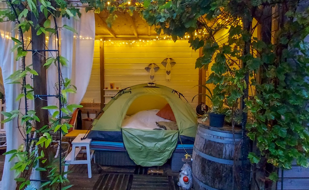 Inmiddels heb ik mijn buitenbed ‘herfst-proof’ gemaakt door een koepeltentje op de kop te tikken, want om steeds mijn beddenboel weer op te ruimen als er een regenbui(tje) wordt verwacht, daar ben ik gewoon te lui voor. Als de wind van een bepaalde kant komt, dan wordt alsnog mijn bed nat namelijk.