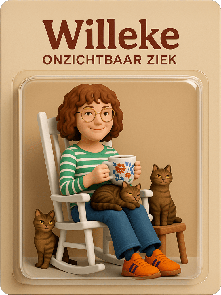 Helaas kan ik in de werkelijkheid liggend niet zoveel. Typen op mijn laptop bijvoorbeeld, lukt me niet. Kleine stukjes op mijn telefoon wel, (Zie de blogfoto, gemaakt met AI voor een site, die aandacht vroeg voor onzichtbare en chronisch zieke mensen.) maar in no time krijg ik dan pijn in mijn handen, een duidelijk signaal om te stoppen. Wat ik dan ook direct doe.