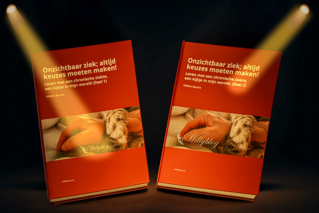 Ik heb jaren door mijn werk in de spotlights gestaan (ook letterlijk in dit geval), door mijn ziek-zijn kwam dat niet meer voor en moest ik mezelf weer terug zien te vinden. Ik moest erkennen dat ik nog steeds ben-wie-ik-ben, ook al ben ik ziek. Daarom vond ik het een goed idee om mijn ‘Willyblog-boeken’ in de spotlights te zetten! Ik erken dat ik ziek ben én nog steeds kan creëren!